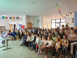 „Lesen ist kein Zeitvertreib, es ist die schönste Art, seine Zeit zu nutzen!“ Auf diese wunderschöne Art haben wir in der Lindenhofschule am 21.11.2025 unsere Zeit genutzt. Gleich nach der ersten Pause fanden sich alle SchülerInnen in der Aula ein, um Herrn Brauns Geschichte über einen kleinen Pinguin zu lauschen. Schnell schlossen die Kinder den kleinen Pinguin, der Buchstaben verdrehend von Scheissolle zu Scheissolle (= Eisscholle zu Eisscholle) hüpft, um eine Meise zu rachen (=Reise zu machen) in ihr Herz und hörten aufmerksam zu, um keinen Wortverdreher zu verpassen. In der abschließenden Fragerunde waren sich alle einig, dass dies eine großartige Geschichte war und Vorlesen einfach eine der wunderbarsten Möglichkeiten ist, seine Zeit zu nutzen.